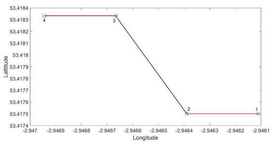To evaluate the link performance of the Sheil Road deployment, we first simulate the network layout using MATLAB as shown in Figure 4, based on the information identified in the previous section. The MATLAB simulator is built to accurately model the properties and parameters of IEEE 802.11ad networks and closely represents the deployment in Liverpool 5G Create in terms of node position and alignment. Specifically, in Figure 4 there are three links used to connect three IEEE 802.11ad access points (APs), i.e., nodes 2–4, with node 1 acting as a gateway according to the 5G Create deployment illustrated in Figure 3. Moreover, links that are configured to work on the same channel have the same colour in the figure, i.e., red for Channel 2 at 60.48 GHz and blue for Channel 3 at 62.64 GHz. Table 2 summarizes the main simulation parameters [32,33,34].