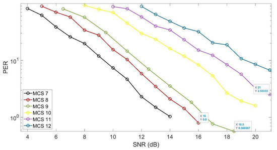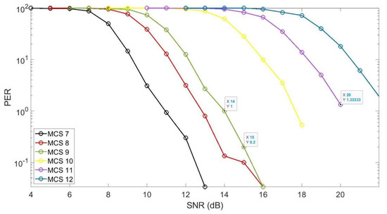 We evaluated the individual link performances in terms of their Packet Error Rate (PER) as a function of the signal-to-noise ratio and for different modulation and coding scheme values. Specifically, first, a set of SNR points in dB were selected based on each simulated MCS. Second, for each SNR point, multiple packets were transmitted through a TGay millimeter wave channel [34], then synchronized and demodulated, and the received Physical Layer Convergence Procedure Service Data Units (PSDUs) were recovered. Third, the received PSDUs were compared to those transmitted to determine the number of packet errors and hence the PER. The number of packets considered to compute the PER for each SNR point depends on the following parameters: (1) the maximum number of packet errors simulated at each SNR point. When the packet error number reaches this limit, the simulation at this SNR point is finalized; (2) the maximum number of packets simulated at each SNR point, which limits the length of the simulation if the packet error limit is not reached. In order to obtain meaningful results, we considered 100 and 1000 as the maximum number of packet errors and maximum number of packets, respectively [34].