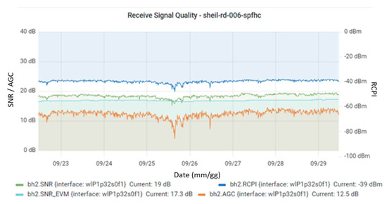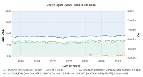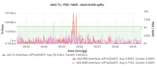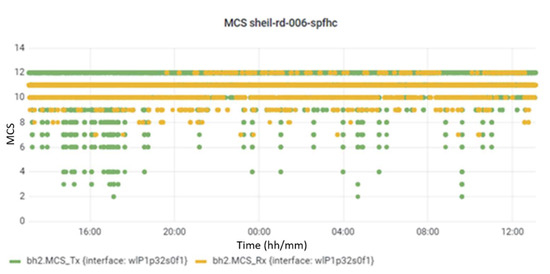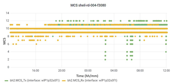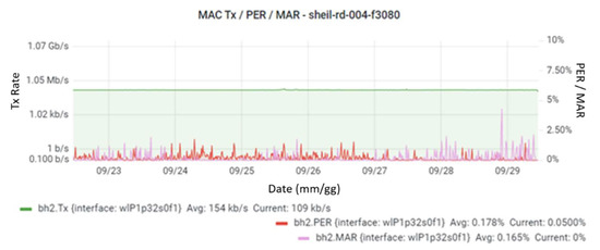 Specifically, Link 2 connects the node with ID sheil-rd-003-f8627 to the node with ID sheil-rd-004-f3080, represented as Node 2 and Node 3 in Figure 4, respectively. Figure 7, Figure 8 and Figure 9 illustrate, among other parameters, the SNR (green line in Figure 7), the performance in terms of PER (red line in Figure 8) and the MCSs (yellow circles in Figure 9) at the receiver node, i.e., node sheil-rd-004-f3080. Other parameters that can be monitored through Grafana and that we do not illustrate because they are out of the scope of this paper are: the Received Channel Power Indicator (RCPI) (blue line in Figure 7); the Automatic Gain Control (AGC) (orange line in Figure 7); the MAC transmit rate (Tx Rate) (green line in Figure 8); and the Modulation error ratio (MAR) (lilac line in Figure 8). From these figures we can note that some parameters present a high oscillation amplitude and, therefore, we also included the average value of each parameter at the bottom of the diagrams. In summary, we can conclude that the average SNR is 14 dB, the PER on average is 0.18% and the average MCS value is 9.