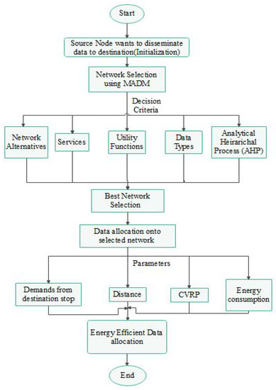 Over the last few years, we have witnessed the rapid growth of vehicles in urban areas together with the increase of internet-enabled devices integrated into vehicles [36]. Vehicles are being used as mobile nodes to create a mobile ad hoc network. They move randomly and communicate either with moving vehicles or fixed equipment such as RSUs. This alternative communications network layer of public transport networks will include public vehicles moving around the city. The flowchart given in Figure 2 gives an overview of the overall workflow of the proposed system. We will first apply the MADM methodology for the selction of the best network in the heterogeneous network, and next, we will offload data onto selected public vehicles to carry it until the destination for energy-efficient data transmission.