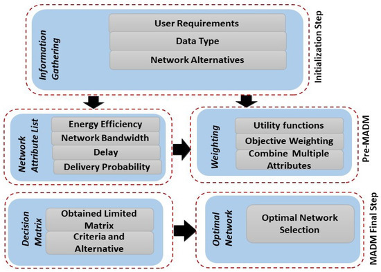 MADM algorithms have high accuracy and low difficulty. They capture different parameters (e.g., QoS, bandwidth, delay, data volume, cost, etc.) and select the most suitable network. There are many possible solutions for MADM problems. The whole process of network selection is shown below, in Figure 3.