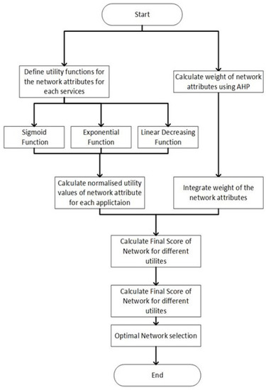 Next, considering all the requirements in the process of network selection, we integrate utility theory with the AHP process to design our network-selection algorithm, as shown in Figure 4. We consider the characteristics of different types of services and their respective weights to define utility functions and the scores of a user’s preferences by defining rank preference through AHP. Therefore, we are providing a comprehensive structure for users to give their preference, which the controller can use to make decisions based upon their requirements.