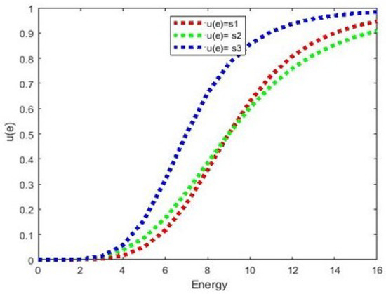 - Utility function for Energy Efficiency EE: In this utility function, EE, as discussed, is a beneficial criterion, and the energy-efficient utility function will be modeled as a sigmoid curve. The sigmoidal utility function is defined below:where and e represent the average network energy efficiency and network energy efficiency; x is used as a constant value that is always greater than zero . The notation c is used to denote the sensitivity of network attributes affecting energy efficiency. The utility function for EE is plotted in Figure 5; we can make sure that the utility function is monotonic and concave–convex. In physical terms, Equation (2) is the result of a higher network energy efficiency, with e translating into a larger utility function, , resulting in a more preferred network.
