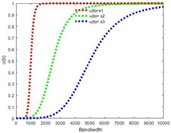 Figure 6. The utility function for Bandwidth. - Utility function for Delay Tolerance: Generally, incremental latency values are acceptable in a Delay-Tolerant Networks (DTN). While designing the utility function for network delay tolerance, a larger network delay value will result in a lower utility value. It is a decreasing criterion to measure network delay. Delay varies in both networks as per the data volume. u(d) is defined as a utility function for the delay, as below:where is the maximum delay and x is the sensitivity factor for delay calculation among both networks. The delay utility function is shown in Figure 7.
