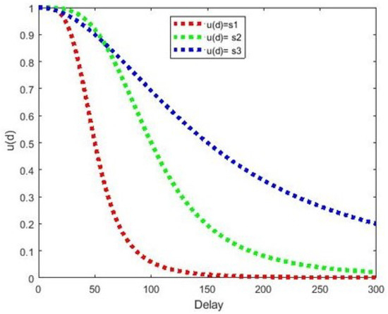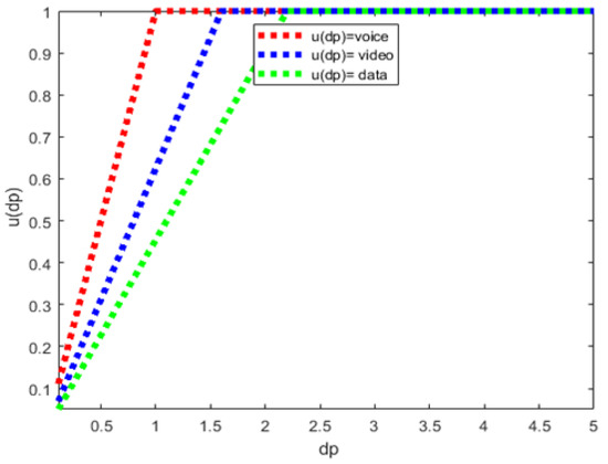 Figure 7. The utility function for delay tolerance. - Utility function for the Delivery Probability: Delivery probability is to be defined as the volume of data to be sent using any of the networks. We defined the utility function of delivery probability as , where , in case of successful delivery, is 1, and otherwise, for packet loss, it will be considered as 0. Otherwise, it lies between 0 and 1. is the delivery probability obtained and is the maximum delivery probability that is acceptable to the user, and is shown in Figure 8.