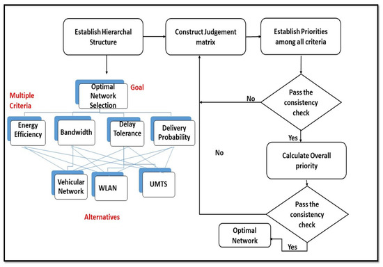 - Analytical Hierarchical ProcessThe analytical Hierarchical process (AHP) method is a multi-criteria decision-making process for network selection. It was developed at the Wharton School of Business by Thomas Saaty in the 1970s [38]. AHP works on the function of priority and rank to evaluate subjective weights to achieve the specified goals. We have used this process to select a best-featured network from the given alternatives for the given service class based on the following criteria—Energy Consumption, Bandwidth, Delay, and Delivery Probability. We have also used this process for choosing a priority of network types for each data type. Network weighing is an important factor to characterize the network performance and user’s preferences. We use the hierarchy analysis method to allocate the appropriate weight to each selection metric.We further categorize traditional networks into WLAN and UMTS networks for impartial scheming with different attributes, as shown in Figure 9. The logical flowchart of the AHP algorithm considers the hierarchical structure with the main goal, multiple criteria, and network alternatives to select. We have defined utility functions for all the attributes for a network assessment. A user’s preference will be based on multiple criteria for network selection. We assume that WLAN users have wireless access to their system, but with a fixed location—or we can say a local network—and that they use all their devices to avail the services and disseminate data to nearby RSUs for further transmission. However, they have good speed and bandwidth values. On the other hand, UMTS is a mobile cellular device and can roam around with their data plans, but with limited bandwidths and larger delays as per the delivery probability and data network’s range.