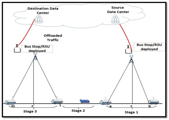 Many co-operative data collection approaches from different locations have been proposed [12]. These approaches find [13,14] vehicles as optimal and logical links for transferring big data. Therefore, traditional homogeneous network communication, hand-off algorithms, and data offloading are a few diverse applications [15] proposed to offload data onto different networks while considering different attributes. The public transport-assisted data-dissemination system can be interpreted as a delay-tolerant network where RSUs will be placed on each bus stop and communication between buses and RSUs occurs once the bus stops or passes by bus stops.