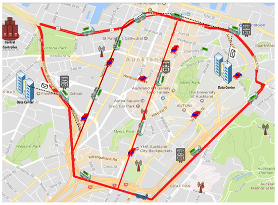 We will consider Auckland Central as shown in Figure 11 as an area for data analysis and as the locations to show the vehicle’s distribution among different bus stops. We have considered four different locations: City Center, Britomart, Wellesley Street, and Auckland Hospital. All of these bus stops are equipped with local storage for data storage to upload or download onto buses on that route. Furthermore, all users’ profiles are checked, as per the source and destination location of the data transmission, and buses are selected based upon that.