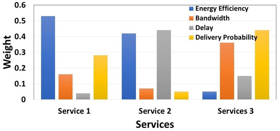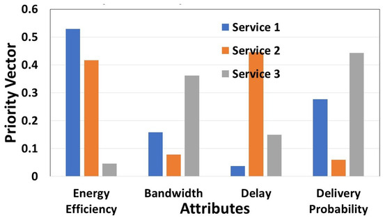 There is a list of available networks to choose from. We collect all the network attributes in list , named energy-efficient , delivery probability , delay demand , and available bandwidth of both networks. Then, we follow all the steps to rank the network among all the networks, as per different services. We use this network-selection technique only to offer the best option as per their requirements to maintain QoS. It is mandatory to pass the consistency check in AHP in order to obtain an accurate judgment matrix. If any of the matrices fail to pass this check, the user will have to give preferences to the design matrix. We will first analyze public vehicle distributions near bus stops to know the availability of networks to choose from, and then further evaluate the performance of all networks for different services. Figure 12 illustrates the criteria weights given to all the attributes as per different services. For example, as discussed before, Service 1 has delay-tolerant features and will be considered an energy-efficient data-dissemination network. Therefore, the criteria weight will be allocated more heavily on the EE attribute. In such a way, all the weights are distributed as per the service profile. The priority vector is calculated for all the services as per different attributes as shown in Figure 13. The final score is calculated as discussed in Figure 14. Utility functions are defined already for all the attributes. For all of these services, we will have different utility values. We will score our network based upon the maximum utility value for all the services.