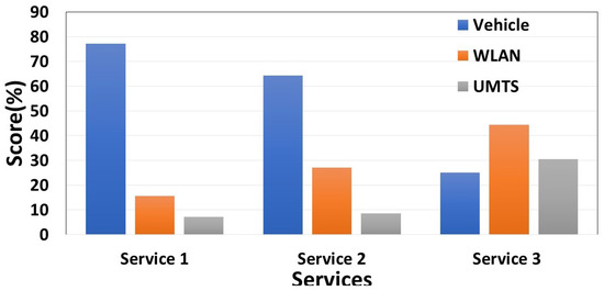 The AHP score is the final ranking of all the services as per the preferences given for all the attributes. For service 1, the ranking order is , as the data is delay-tolerant and can be carried by vehicles for energy-efficient data-dissemination, as shown in Figure 14. However, service 2, which is delay-sensitive but for a larger volume than service 1, also gives preference to vehicular networks for data-delivery, rather than WLAN and UMTS, with a ranking order . For service 3, the network ranking preference is in the order of for the urgent delivery of data so as to sustain QoS. In network dynamics, the most important factor is packet delivery without loss. Our heterogeneous network architecture guarantees the delivery of data by using any of the available networks and considering different attributes.