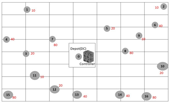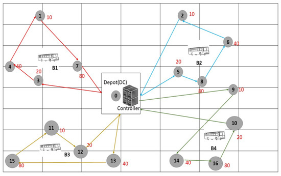 As shown in Figure 15, there are many bus stops around and demands have been allocated to the DC for data allocation onto the suitable bus. The controller will make an energy-efficient decision based upon Equation (13). DC is the central depot, where the bus begins and finishes its journey. As per Table 12, different data demands are generated for data being delivered from the parent stop to the destination stop. The controller identifies 4 buses, B1, B2, B3, and B4, to fulfill all demands with an energy-efficient solution. The total capacity of each bus is 150TB. The distance to each bus stop has been given from the central depot or source bus stop.