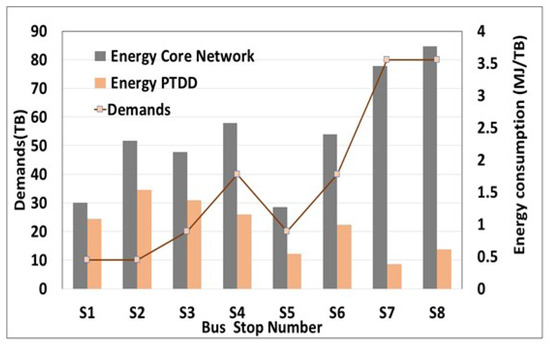 In our analysis, we have used 16 stops, which will be covered by four buses, to fulfill their demands being allocated from a DC to deliver data. In Figure 17 and Figure 18, we can see that it is possible to disseminate data either from the core traditional network or PTDD in the heterogeneous network. However, if we have delay-tolerant data and can utilize public transport, PTDD is an energy-efficient solution. Bus stops 1 and 2 have demands of 10 TB, bus stops 3 and 5 have demands of 20 TB, bus stops 4 and 6 have demands of 40 TB, and bus stops 7 and 8 have demands of 80 TB.