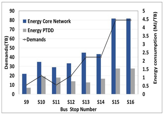 As shown in Figure 18, bus stops 9 and 10 have demands for 10TB data, bus stops 10 and 12 demand 20 TB data, bus stops 13 and 14 demand 40TB data, and bus stops 15 and 16 have demands for 80TB data. The bus will carry and deliver data at each bus stop as per their demands. For the maximum demands of 80TB, we can analyze that the core network consumes 33% more energy than PTDD for data transmission.