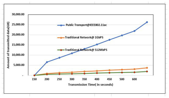 A bus that stops for 500 seconds, for a total 60 buses, can offload 64.8 GB/day, with an effective throughput of 22.03 MB/s. Moreover, transmission performance is also highly influenced by the number of buses in a day and the stoppage time at a bus stop. Figure 19 shows the transmission performance of each network for different data rates. We have considered that public transport will be using IEEE 802.11ac as a network interface for data allocation. However, for comparison, we use the bandwidth of 512 MB/s and 1 GB/s in the traditional network to have a real difference. The outcome demonstrates that our proposed public transport network outperforms the traditional core network.