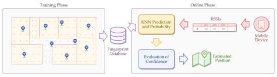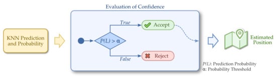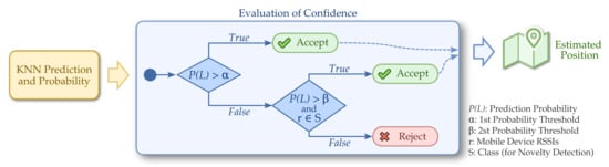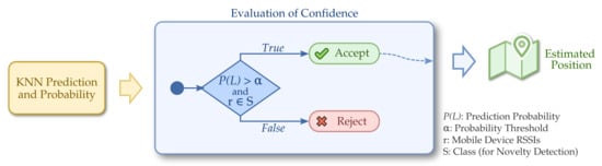 The main limitation of the RSS-based localization systems is the RSS fluctuation, which can induce several errors even when using machine learning techniques. This fluctuation can result in classifications/positions with low reliability. Thus, an intuitive step is to detect and discard these classifications to get more reliable results with better quality. Thus, in our proposed solution, we created an additional step called “Evaluation of Confidence”. For this, we use the prediction probability provided by KNN and the Novelty Detection technique to detect and discard classifications that are not considered reliable and, often, have higher errors. This is done using prediction probability, which is an additional step on the KNN technique based on the distances of the k nearest neighbors. Additionally, a second filter was created that uses the concept of “novelty” which uses machine learning techniques to categorize a new classification as “normal” (belongs to that class) or “novelty” (does not belong to that class).
