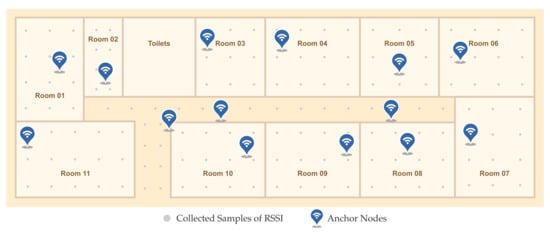 For the label of the samples, two granularities were used. For room classification = {41, 57, 40, 53, 39, 47, 51, 62, 45, 43, 61, 46, 16, 63}, where each number represents the ID of a room. For the classification of specific points inside rooms, the labels have the format R_X_Y that represents the R as the room ID, X as the line, and Y as the column inside the room (with cells of approximately 2 m × 2 m).
