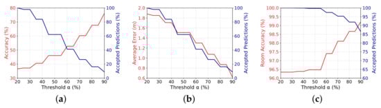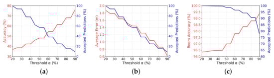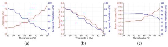 Figure 8b shows the behavior of the average localization error (in red) and, again, the percentage of accepted estimations (in blue) as we increase the threshold