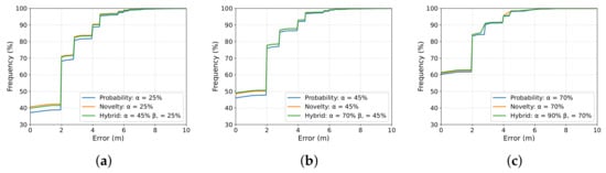 It was observed in the previous sections that the lower the probability threshold, the higher the localization error. Thus, in this hybrid solution, we use the prediction probability for higher values of as a first, initial filter. Then, we use a lower probability threshold to get possibly wrong estimations and apply the stricter, novelty detection test, to confirm their predictions. Thus, we expect to mitigate the loss of predictions in the highest probabilities and, thus, have some lost estimations only in the predictions with lower probabilities.