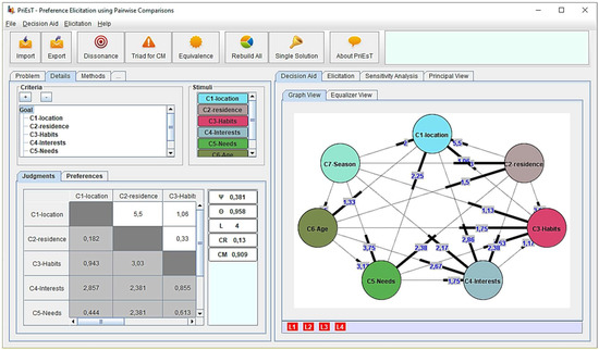 (2) Calculating weights of criteria: After performing pair-wise comparisons, estimations are made resulting in the final set of weights of the criteria. For simplicity, the ‘Priority Estimation Tool’ (PriEst) [48] has been used, which is an open-source decision-making software that implements AHP, to perform calculations for the theory (Figure 1).