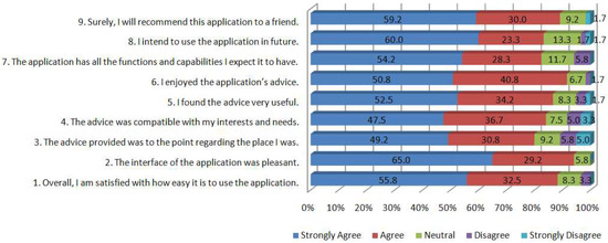 The results evaluating the usefulness of the developed mobile application in relation to the awakening of environmental consciousness, presented in Figure 2, showed students perceived the application to be interesting, enjoyable, easy to use, accessible, and insightful. In particular, a total of 67% strongly agreed that the application was easy to use, while 78% of the participants found its interface pleasant. When students were asked about the personalized advice provided, the majority of them (49.2% + 30.8% = 80%) agreed that the advice was highly related to the place they were in at the time they displayed, and a corresponding remarkable percentage (47.5% + 36.7% = 84.2%) agreed that the advice was compatible with their interests and needs. These results support the effectiveness of the model used for selecting the most suitable advice regarding the use profile and the overall context. Moreover, 52.5% of the participants strongly felt that the advice was very useful, while 34.2% agreed to this statement. It should also be noted that 50.8% of the students strongly enjoyed the application’s advice, while 40.8% agreed with this statement. Concerning the system’s operations, a very high percentage of the participants (54.2% + 28.3% = 82.5%) agreed that the application provided all the functions and capabilities they expected. Furthermore, a total of 83.3% agreed that they intended to use the application in the future, while 13.3% chose to be neutral and 3.4% disagreed with this statement. Similarly, an extremely large group of 89.2% stated that they would recommend this application to a friend, while 9.2% declared neutrality and only 1.7% disagreed with this statement. These findings reflect the user acceptance of the developed application and the positive impact after using the developed mobile application.