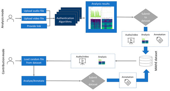 The main functionality of the MAthE AudioVisual Authentication framework is shown in Figure 1. Users can submit files for analysis and investigation, or contribute by annotating existing files concerning their authenticity. Once a file is submitted, the application returns analysis results, and the user can decide if they want to submit the file to the database along with an annotation (tampered or not tampered), submit the file to the database without annotation, or not submit anything to the database. Contributing users can access submitted files, annotated or not, examine the analysis results, and provide annotation (tampered or not tampered), following a crowdsourcing methodology.