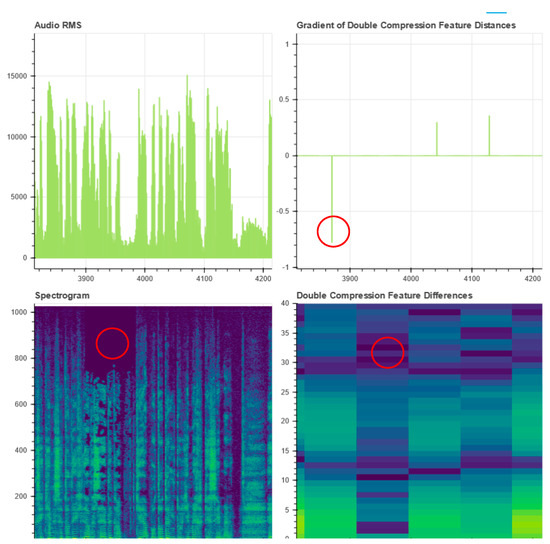 Another methodology for audio tampering detection investigates file encoding and compression characteristics. A huge number of highly configurable audio encodings are available that differ in terms of compression ratio, bitrate, use of low-pass filters, and more. A file that comes from audio splicing is very likely to contain segments encoded with different configurations, which can be traceable [34,35,36]. Most encoding schemes depend on psychoacoustic models that apply algorithms to discard redundant, inaudible frequencies. The Modified Discrete Cosine Transform (MDCT) coefficients can be investigated using statistical or machine learning methods to detect outliers in specific segments of the file [37]. Even when the file is reencoded in another format, there are often traces of the effect of previous compression algorithms [38,39,40,41].