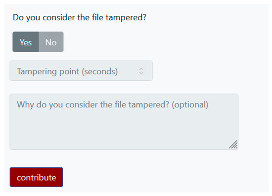 In the Contribute mode, users can annotate existing files of the database, in a crowdsourcing approach (Figure 4). A file is selected randomly. The same environment as in the Analyze mode is provided. The user has access to a media player, as well as the resulting set of interactive visualizations for the detection of possible tampering points. It is noted that the analysis results have already been saved to the database and are loaded directly. The analysis is a computationally complex procedure that requires time, which makes the annotation process much more time-consuming. After seeing the analysis, the user can determine whether and at which point in time the file is tampered, and can also optionally justify this decision with a short description. It is also possible to skip a certain file and select another one randomly. The user’s opinion is stored in the database for the extension of the annotated dataset.