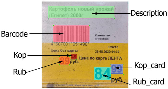 The most important information on price tags to keep track of is usually the price, product name and product specifications. This specific information is subject to the most frequent change and requires continuous verification. Pictures of price tags can also contain a lot of additional information that is not relevant to this study, such as a fragment of the shop counter, fragments of adjacent products and variable text falling outside the areas of interest, and segmentation can be used to get rid of this information. This approach allows us to leave only those parts of the image containing relevant text only.