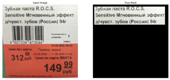 A dataset consisting of “Lenta” retail chain price tag photographs was collected for the neural networks to be trained on. It consists of 80 photos of tags and 80 text files containing label coordinates (for YOLOv4-tiny); every image has a size of 512 × 512 pixels. For UNet, MobileNet and VGG16, the same photos were used along with the masks of segments. The training and validation parts of the dataset were split randomly at a ratio of 3:1. To train neural networks, each image was labeled with the following segments:
