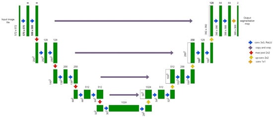 The UNet model architecture is a set of 19 convolutional layers using bottleneck and sliding windows [17,18]. This network has proven to be a reliable and high-quality image segmentation solution. The complete Unet architecture is given in Figure 4.