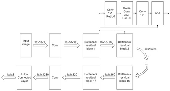 The MobileNetV2 architecture is shown in Figure 5. A distinctive feature compared to Unet is the repetitive application of bottlenecks, which allow the accuracy of the final result to be improved [19,20]. Since this model does not employ the sliding window, shorter training and operation times are possible.