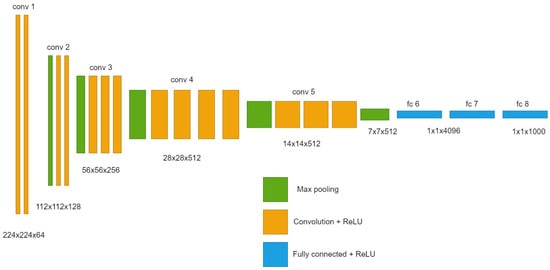 VGG16 is a convolutional neural network presented by K. Simonyan and A. Zisserman [21]. While training on the ImageNet dataset, this model achieved an accuracy rate of 97.2%, thus ranking among the top five solutions for ImageNet dataset. A distinctive feature compared to previous models is the rejection of bottlenecks, which can reduce the neural network training and operating time [22]. This architecture was originally designed for the classification problem, which may raise the question of objectivity in comparing it with other selected architectures. However, if the coordinates of the upper left-hand corner of the segment, as well as its width and height, are chosen as classes, the work will be reduced to a segmentation process, which confirms the objectivity of our comparison. The VGG16 architecture is shown in Figure 6.