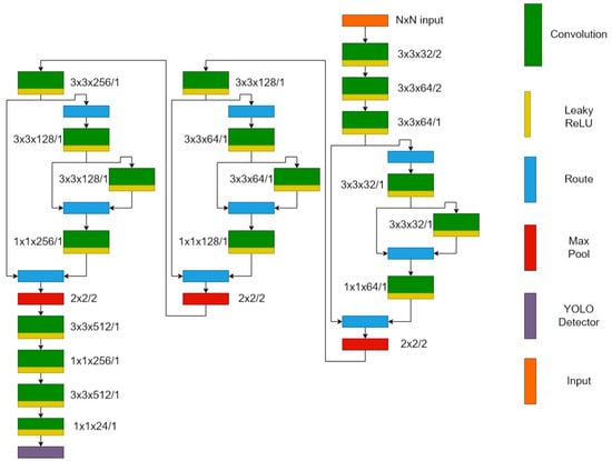 YOLOv4-tiny is a high-speed, real-time image and video object recognition neural network. The architecture of this model is shown in Figure 7 and similarly features a set of convolutional layers. Its distinctive feature consists in obtaining the final results from several intermediate ones, thus significantly increasing the achieved accuracy [23]. Additionally, YOLOv4-tiny allows multiple objects to be displayed that belong to different classes, which can reduce the application of the neural network to just a single run. The segment detector was trained using Darknet repository [24,25].