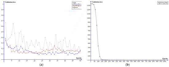 Change in the loss-function: (a) UNet, MobileNetV2, VGG16; (b) YOLOv4-tiny.
