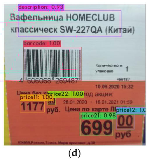 However, for the correct processing of data in the segments found, it is necessary to programmatically expand the areas obtained using the neural network. So, the Description area was increased to the width of the input image, which improved the accuracy. Additionally, since the Description area on the price tags under consideration is not surrounded by unnecessary information, this extension will not affect the subsequent character recognition in any way. Owing to this extension, the accuracy of YOLOv4-tiny can be considered close to 100%, and therefore the accuracy of the entire development will be equal to the accuracy of character recognition.