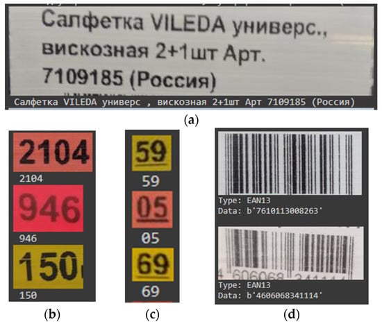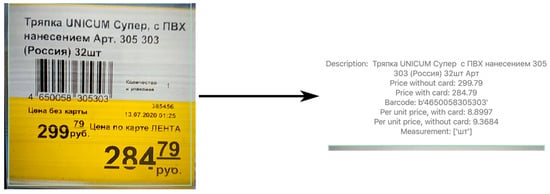 During the analysis of existing scientific works related to the analysis of price tags, studies from several countries were found. M.N.A. Hussin et al. [12] proposed color detection, the use of HSV color space, and edge detection by finding the edge of the largest rectangle to detect different price tags. Their research showed that contour detection is exposed to white and black noise and that the accuracy of OCR drops significantly when there are two fonts in different sizes and the image is taken at a distance. A. Kovtunenko et al. [13] proposed price tag recognition methods using mathematical morphology and convolutional neural networks. The researchers’ algorithm is constructed in such a way that the first step is the detection of the supporting element (such as a barcode), and the other elements on the price tag (such as the product name and price) are detected with a convolutional neural network CRAFT. M. Yong-Qiang et al. [14] proposed the use of a multi-task CNN for the problem of locating decimal points.