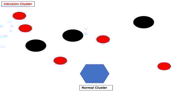 Supervised learning-based intrusion detection system methods detect intrusions utilizing labeled training data. In supervised learning, data are organized in pairs, mapping a host data source or a network and a connected output’s value (i.e., label) that should be in normal modes, intrusion, or precise. Functional features are fitted to the model in the training stage, which discovers the data relationship. Then, the supervised learning algorithms utilize the selected features in training data and find the inherent relationships between the input data and the labeled outcome. These learning algorithms are referred to as classifiers, and they perform the classification task in the detection system. With supervised learning, the labeled outcomes are prearranged and utilized to teach the algorithm how to achieve the necessary outcomes for unobserved data types. In contrast, labels are not specified in unsupervised learning models. Unsupervised learning outlines machine learning techniques that aim to obtain attractive information from input data lacking output labels. The positions of the input data points are processed as an accidental feature set, and a combined density model is then fitted to the dataset. In unsupervised learning models, the data are clustered into a range of output types through procedural learning. In IDS, the unsupervised learning method employs machinery to detect intrusions by applying unlabeled data to train the model. See Figure 2 for cluster classification: intrusion and normal clusters.