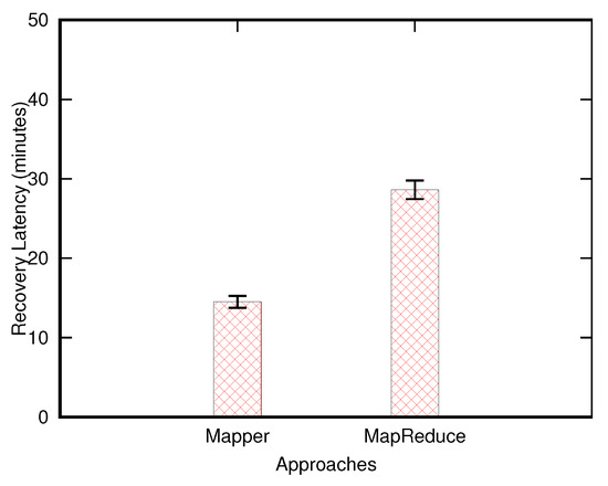 Figure 4 shows the averaged latency and standard deviation for the entire recovery process with the mapper-based and mapreduce-based approaches. Here, the size of an HBase table stored in the source cluster is 30 Gbytes. In the experiment, we recover the entire table, and the latency measured for the recovery includes those required by the table restoration and deployment processes. The experimental results indicate that the mapper-based approach outperforms the mapreduce-based solution as the mapper-based approach introduces few disk accesses without data shuffling due to the mapreduce framework.