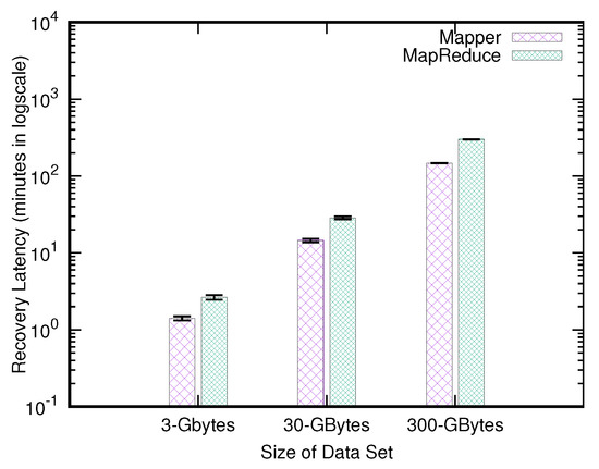 We vary the size of data set from 3 Gbytes to 300 Gbytes, and investigate the performance of our proposed solutions. The performance results are shown in Figure 7. The experimental results clearly indicate that the recovery delays due to our approaches are lengthened proportionally to the size of the data set. We observe that the mapper-based and mapreduce-based approaches increase their recovery delays linearly with the size of the data set. This situation occurs because when the size of a data set is enlarged, the number of key-value pairs increases accordingly. When the increasing number of key-value pairs needs to be manipulated, the numbers of read and write operations for these key-value pairs are linearly enlarged.