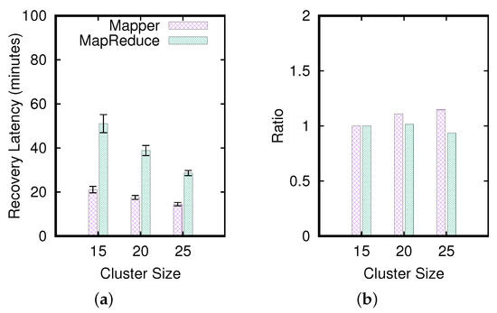 We investigate the effect of varying the sizes of the source, shadow, and destination clusters. Let represent the numbers of nodes in the source, shadow, and destination clusters equal to a, b, and c, respectively. Three configurations are studied, including , , and . Here, the experiment is mainly designed to understand whether the mapper-based and the mapreduce-based approaches scale well for the recovery process.