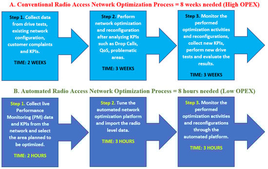 - B5G networks further increase the complexity of network planning and optimization processes since the former must coexist and cointeract with the existing networks (2G/3G/4G/5G) in parallel. The network parameter design, tuning, and management lead to a high complexity in terms of smooth coordination among all existing networks, and it is obvious that as more complex architectures and B5G evolve, network management shall not be feasible without the use of automated SON functions operating in real time and taking direct feedback from the network [8,9,10,11,12,13,14,15,16,17,18,19,20,21,22,23].