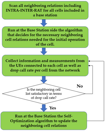 - Nguyen, V.M.; Claussen, H. Efficient Self-Optimization of Neighbor Cell Lists in Macrocellular Networks. In Proceedings of the 2010 IEEE 21st International Symposium on Personal Indoor and Mobile Radio Communications (PIMRC), Istanbul, Turkey, 26–30 September 2010; pp. 1923–1928. [Google Scholar]