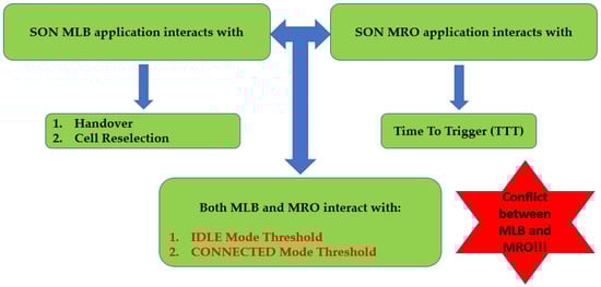 - Zhiqiang, L.; Hong, P.; Xue, K.; Peng, M. Conflict Avoidance between Mobility Robustness Optimization and Mobility Load Balancing. In Proceedings of the 2010 IEEE Global Telecommunications Conference GLOBECOM, Miami, FL, USA, 6–10 December 2010; pp. 1–5. [Google Scholar]