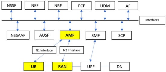 - System Architecture for the 5G System (5GS) (3GPP TS 23.501 Version 16.6.0 Release 16). Available online: https://www.etsi.org/deliver/etsi_ts/123500_123599/123501/16.06.00_60/ts_123501v160600p.pdf (accessed on 7 February 2022).