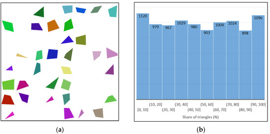 Toy dataset (a) Sample image; (b) Distribution of the share (percentage) of triangles for all images in the dataset.