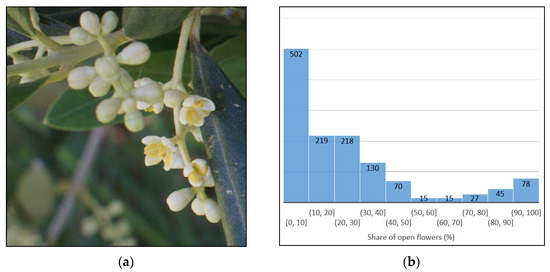 Olive flowering phenophases dataset (a) Sample image; (b) Distribution of the share (percentage) of open flowers for all images in the dataset.