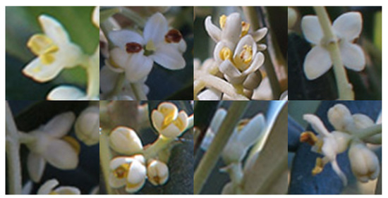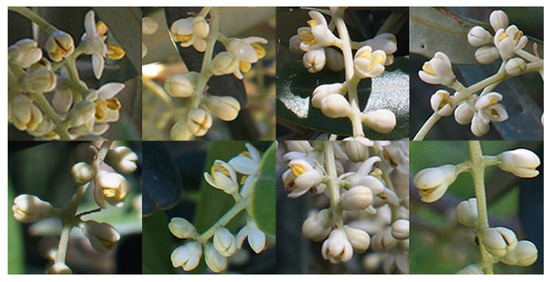 As already stated, for the olive flowering phenophases dataset, the ground truth is provided by human expert annotators. Generally speaking, flowers are defined as “open” when the reproductive parts are visible between or within unfolded or open flower parts. The application of this definition is not simple in practice, as can be seen in Figure 9.