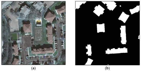 This dataset is derived from the Inria aerial image labeling dataset, used in [29]. Original images are 5000 × 5000 pixels in size. The authors divided the semantic classes of this dataset into “building” and “not building”. To achieve their goal, the authors had to extract building footprints from the cadaster, which resulted in a semantic segmentation mask for each image.