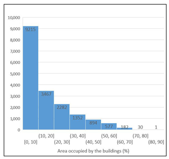 During the preprocessing phase, the original image and its corresponding segmentation mask were divided into smaller subimages (250 × 250 pixels). In the next step, we used the black-and-white mask to calculate the percentage of the image area occupied by the buildings. In the end, a total of 18,000 images were available for the experiment.
