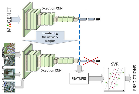 In our experiment, we used bottleneck features to train the representatives of regression models, namely support vector regression (SVR) [40] and random forest regressor (RFR) [41]. The concept of the experiment (Xception + SVR variant) is shown in Figure 7.